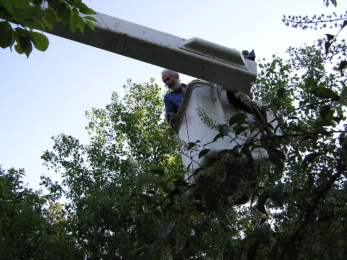 Director of Photography Austin de Besche in the bucket for a crane shot during